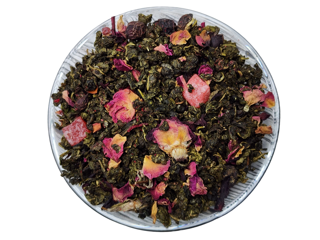 улун, плоды малины, лепестки чайной розы, лепестки граната, гибискус.