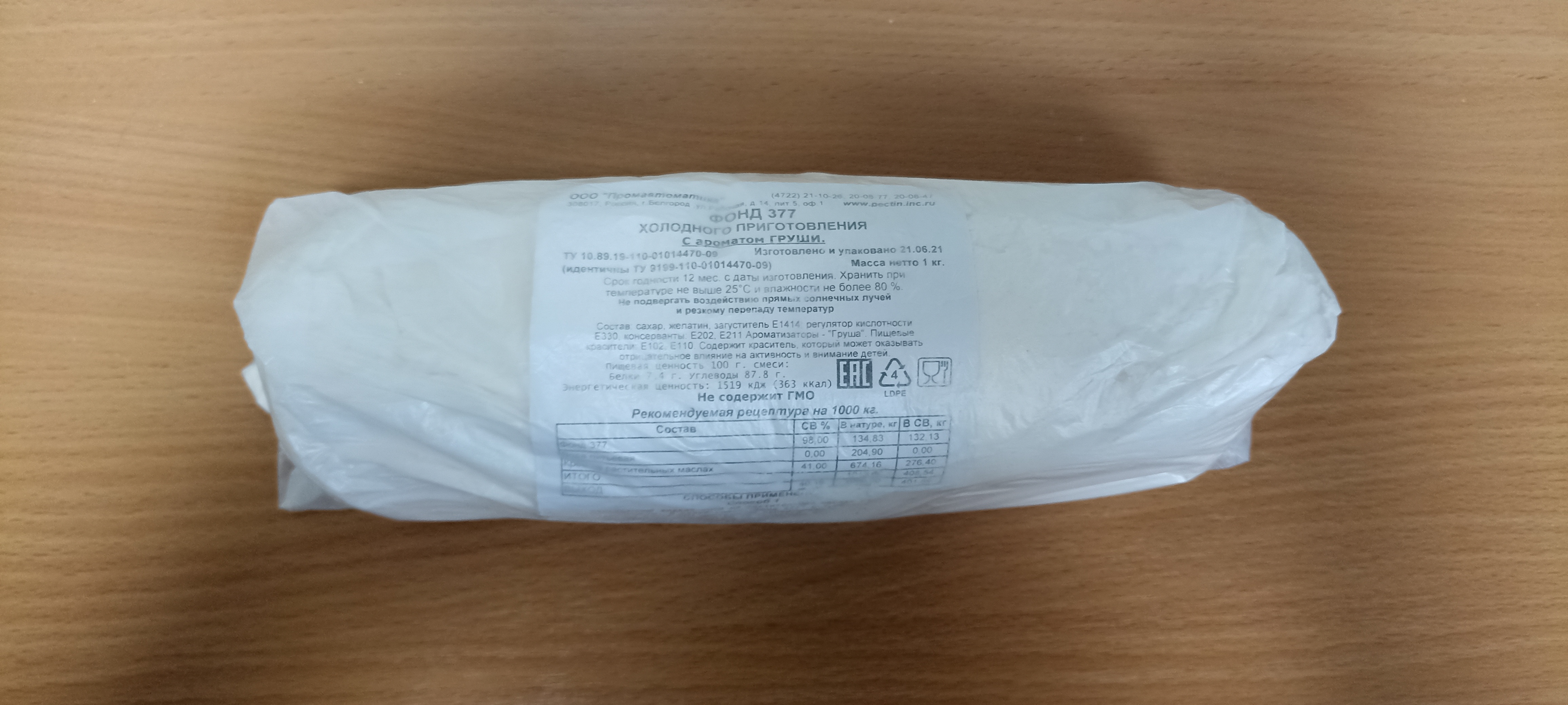Состав: сахар, желатин, загуститель Е1414, регулятор кислотности Е330, консерванты: Е202, Е211, ароматизатор "Груша", пищевые красители: Е110, Е102.